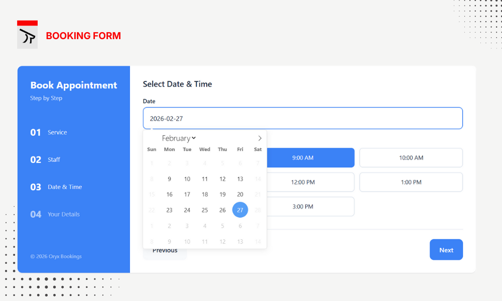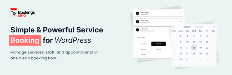 Oryx Bookings is a complete appointment and service booking system for WordPress. Manage services, staff, schedules, and accept bookings with a beautiful frontend form.