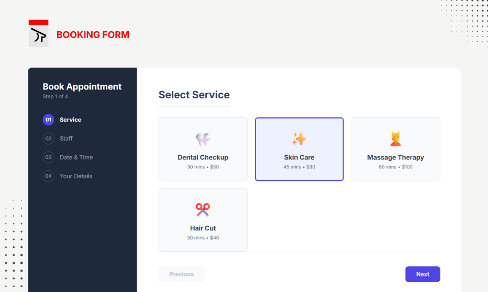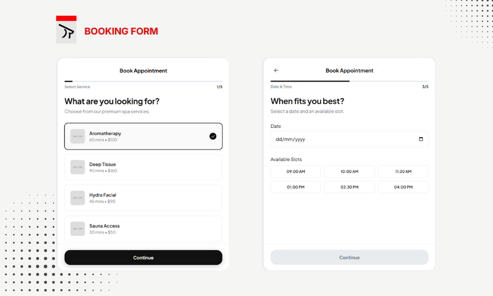 • 6 Booking Form Templates — Grid, Stepper, Accordion, Card Flow, Flat Split, and Focus Input.