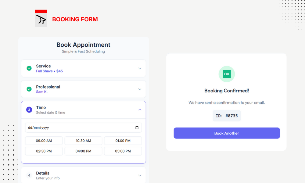 • Booking Form (Frontend): Clean, responsive customer booking experience.