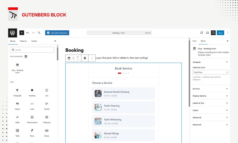6. Add the booking form to any page using the Elementor widget, Gutenberg block, or [oryx_bookings] shortcode